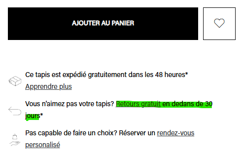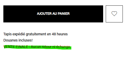 L’admissibilité précise d’un tapis en solde est indiquée sur la page du produit concerné, sous le bouton [AJOUTER AU PANIER] de l’offre du Vendredi fou correspondante: